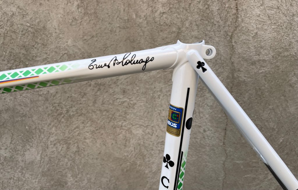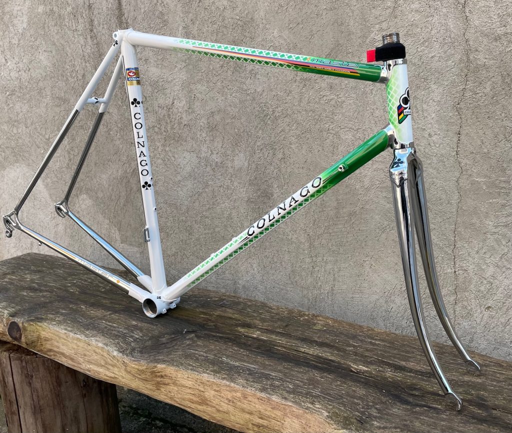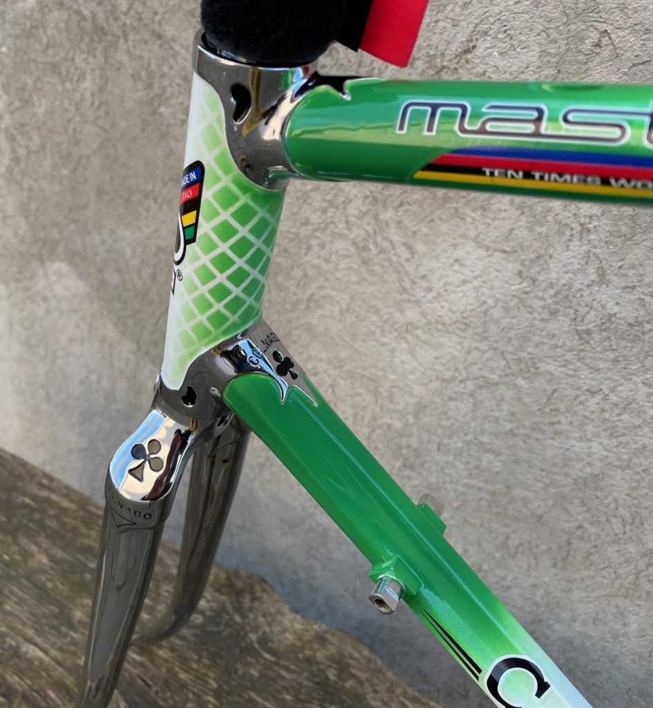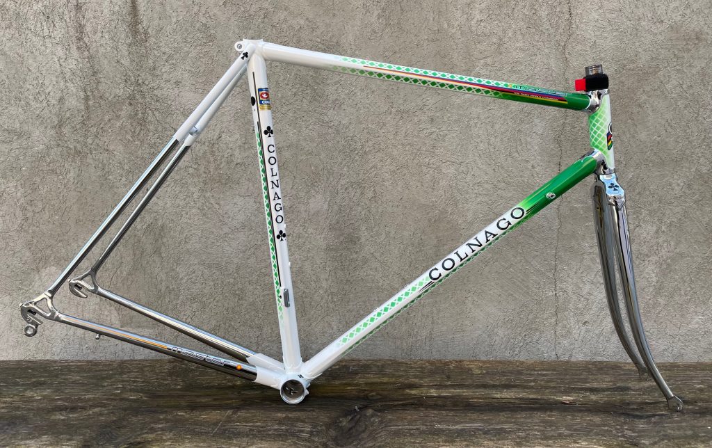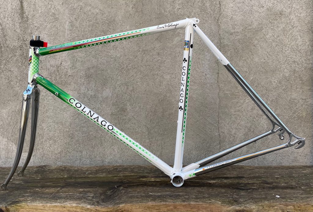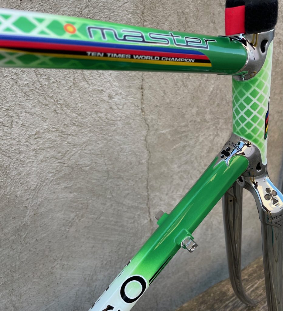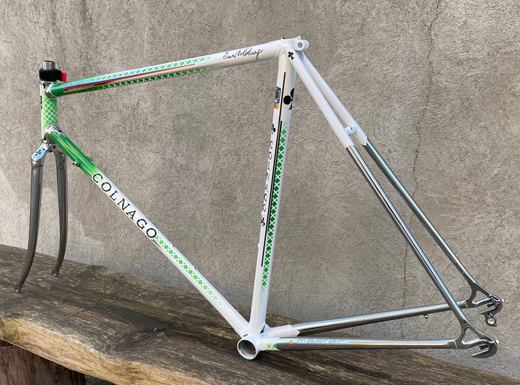 A Colnago Master piu frame in Superconfex team paint scheme. This frame was made and used by a Slovenian professional
