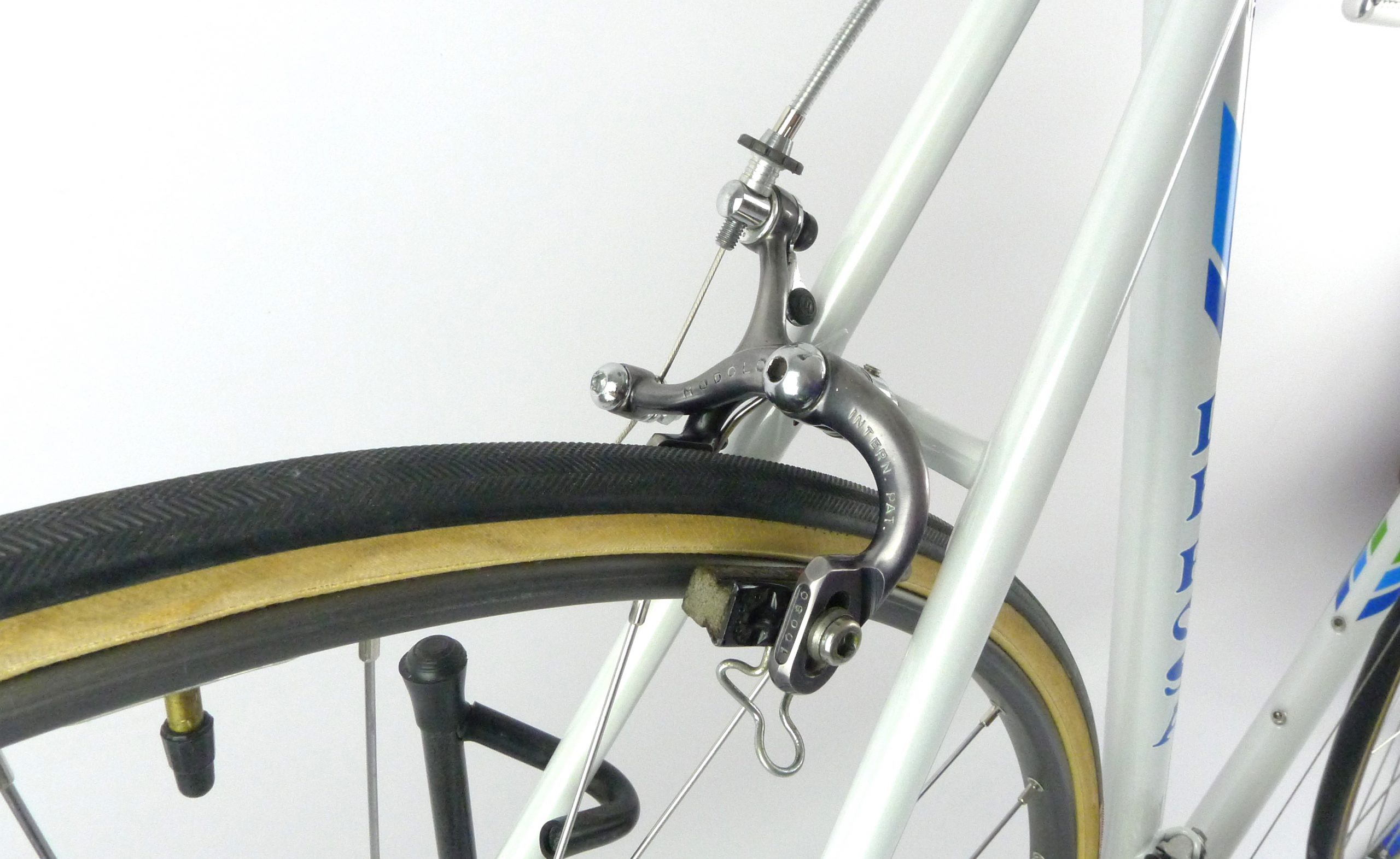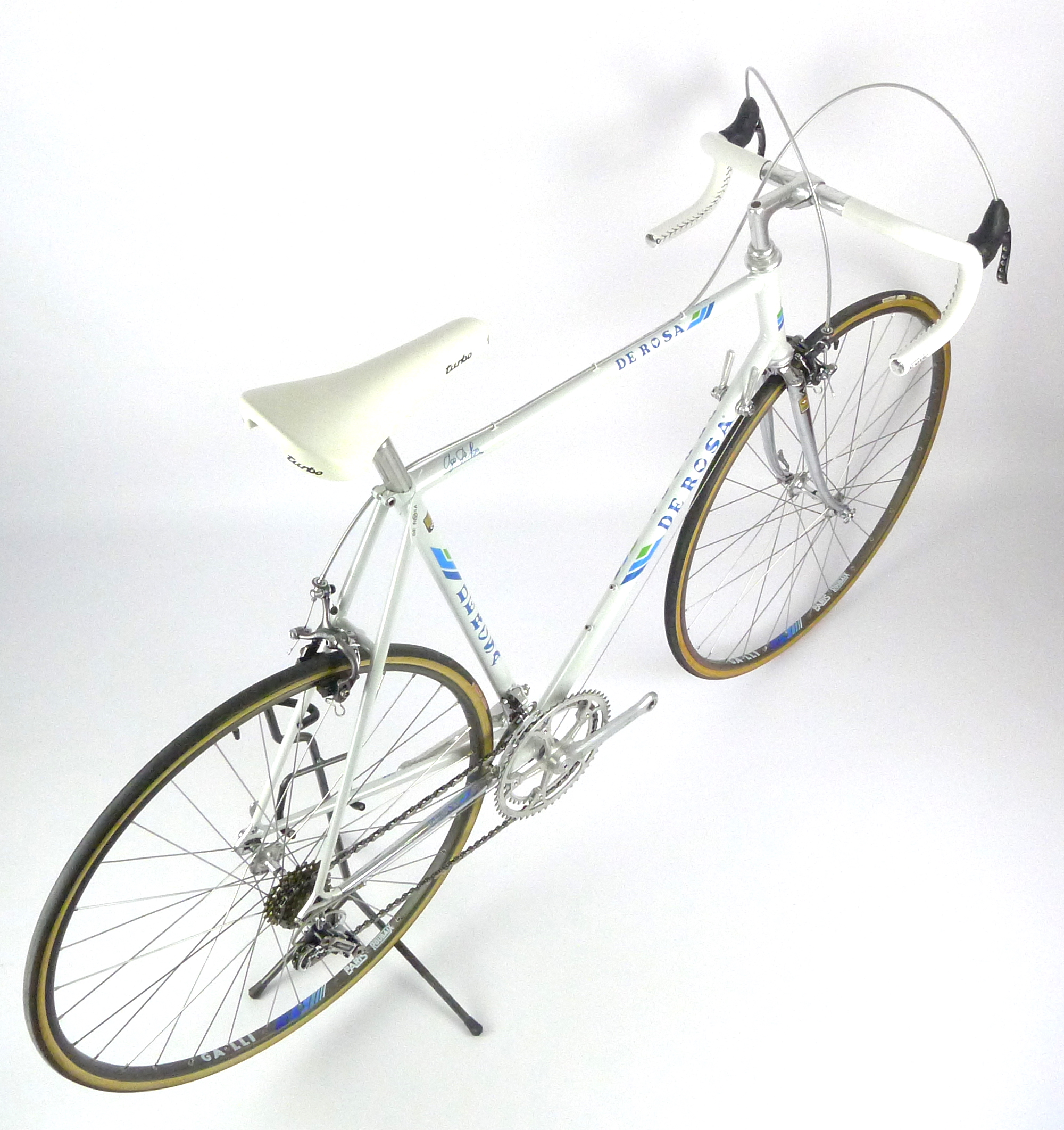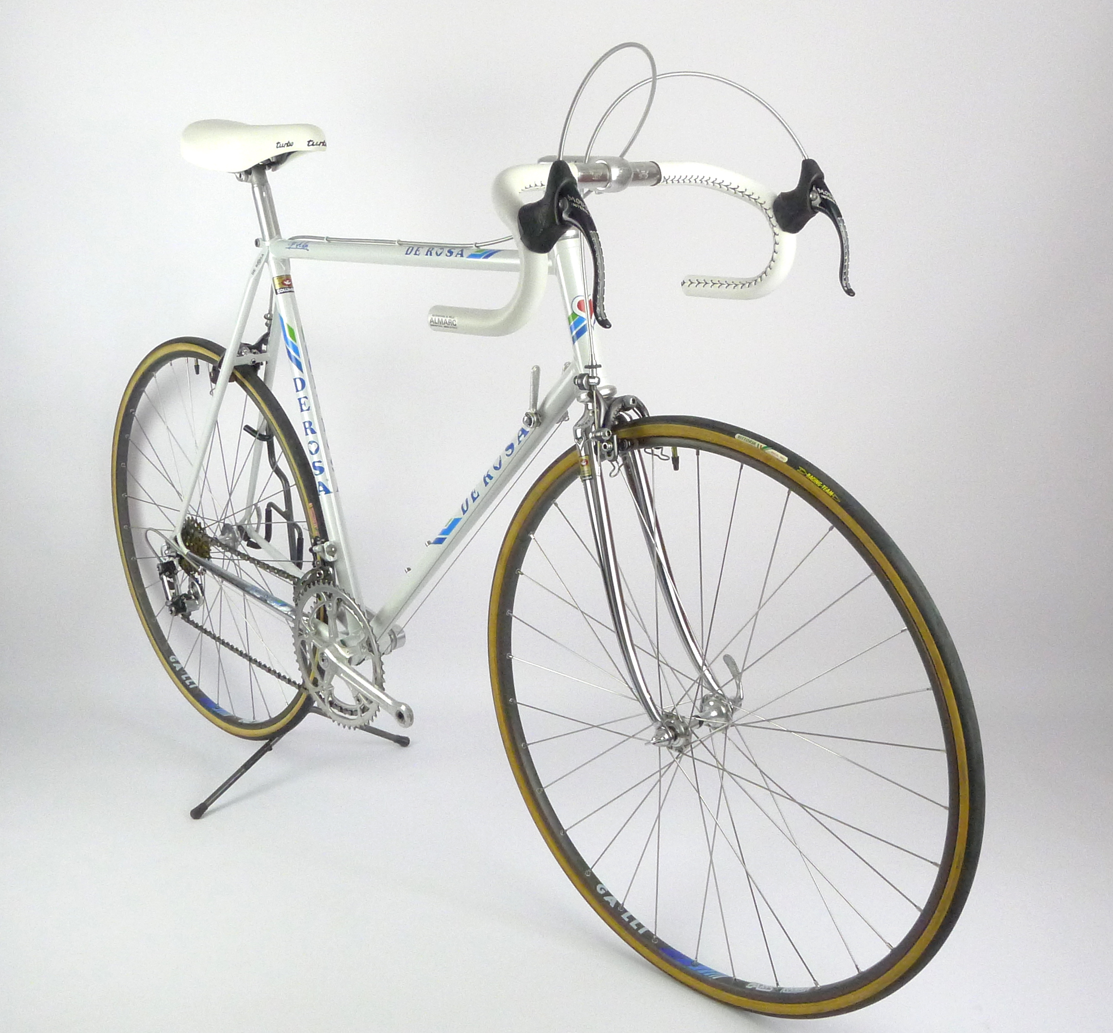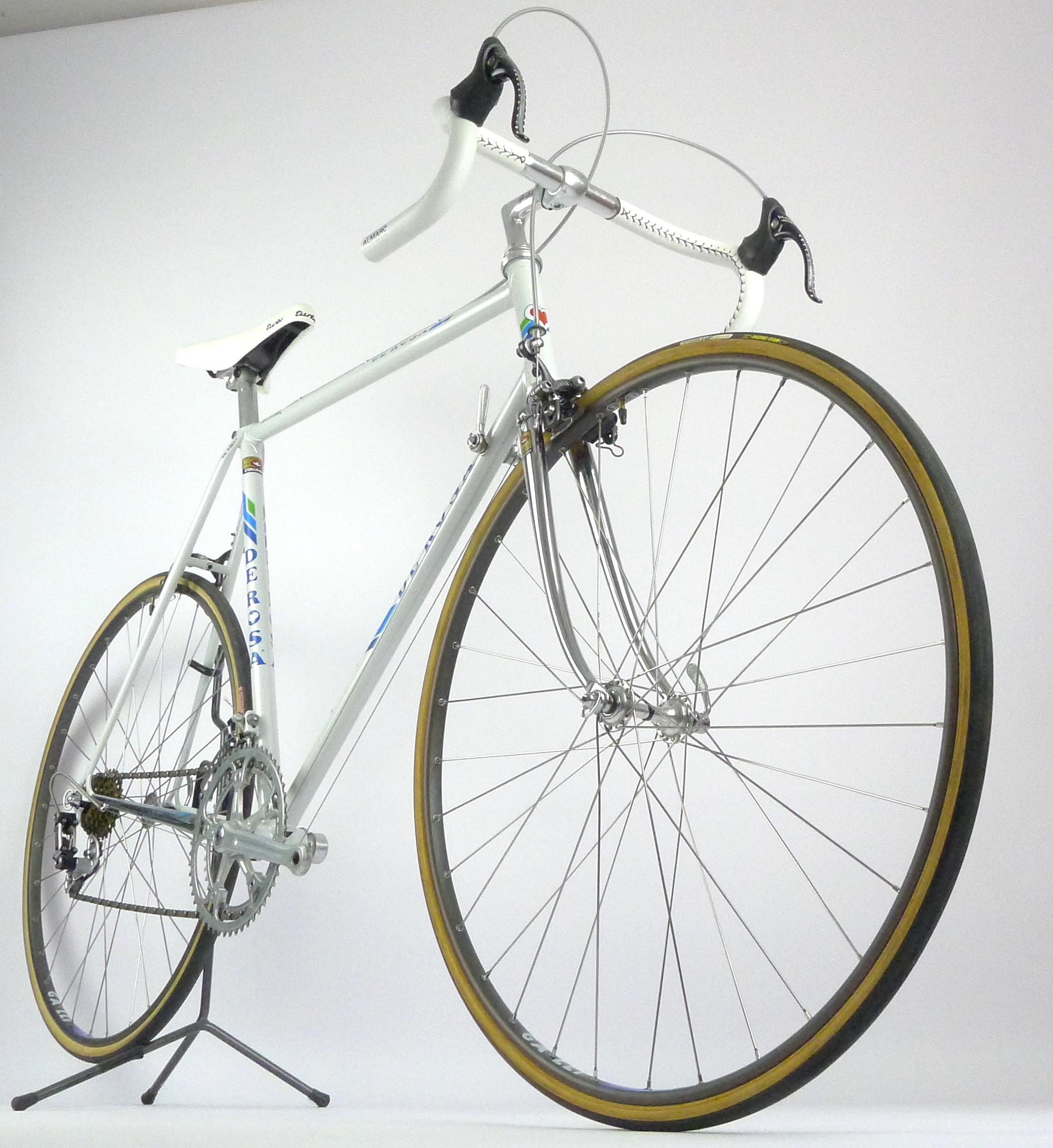 An early Ugo De Rosa Professional Slx with Campagnolo Super Record group, Galli Paris-Roubaix rims and Modolo Inter. pat. brakes. The bike is simply fabulous. The pearl white color and De Rosa equipe decal set. its made with Columbus Slx tubes.