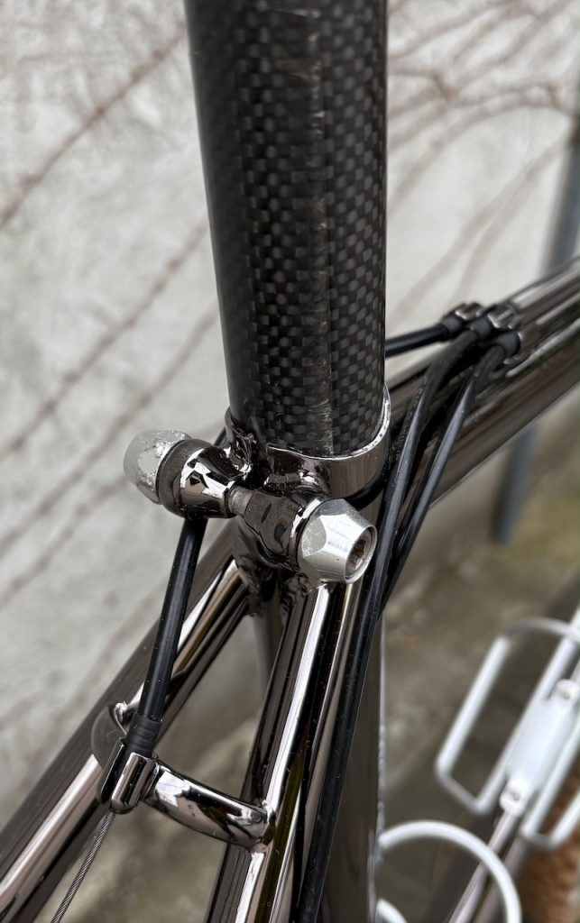 Ex owner of this bike told me that the frame was made by Dario Pegoretti. Marzzocchi XC R front fork. Carbon WR compositi seat post, handlebar and hubs. Groupset mix Shimano XTR and XT.