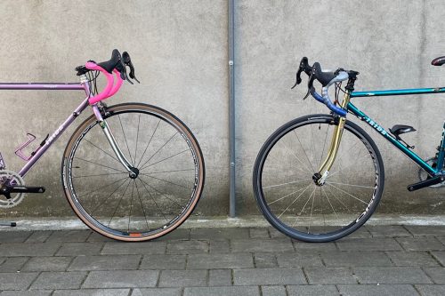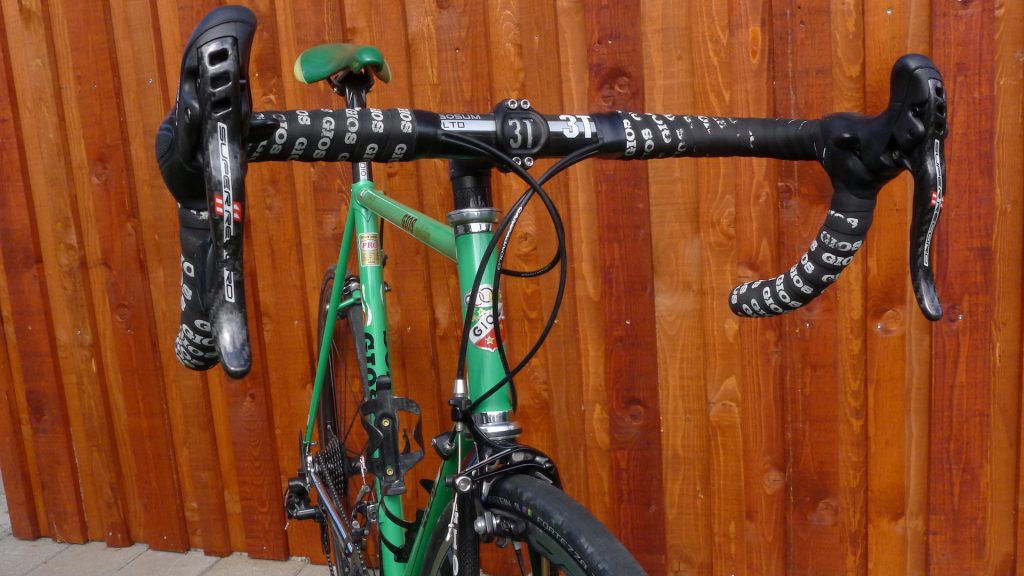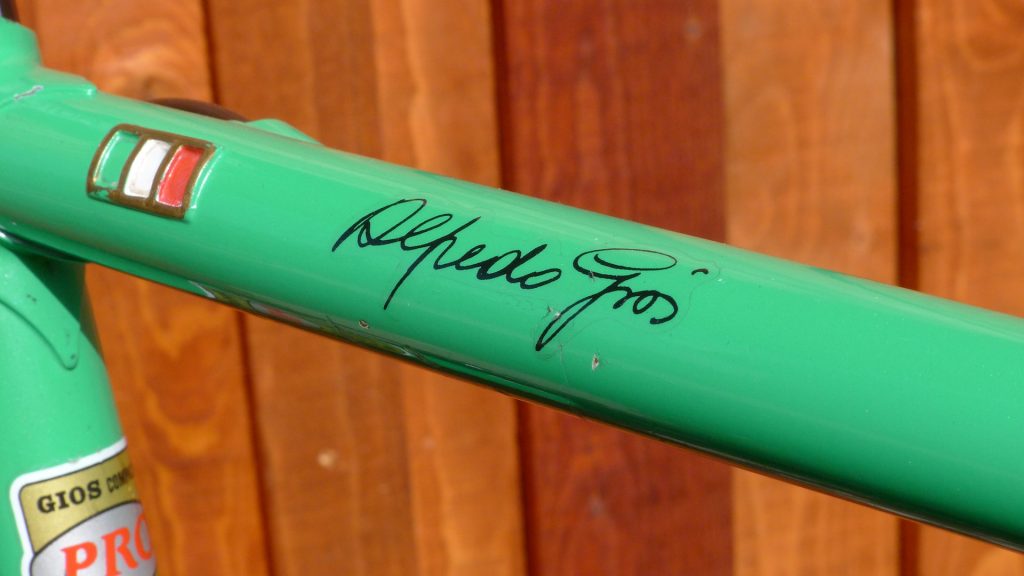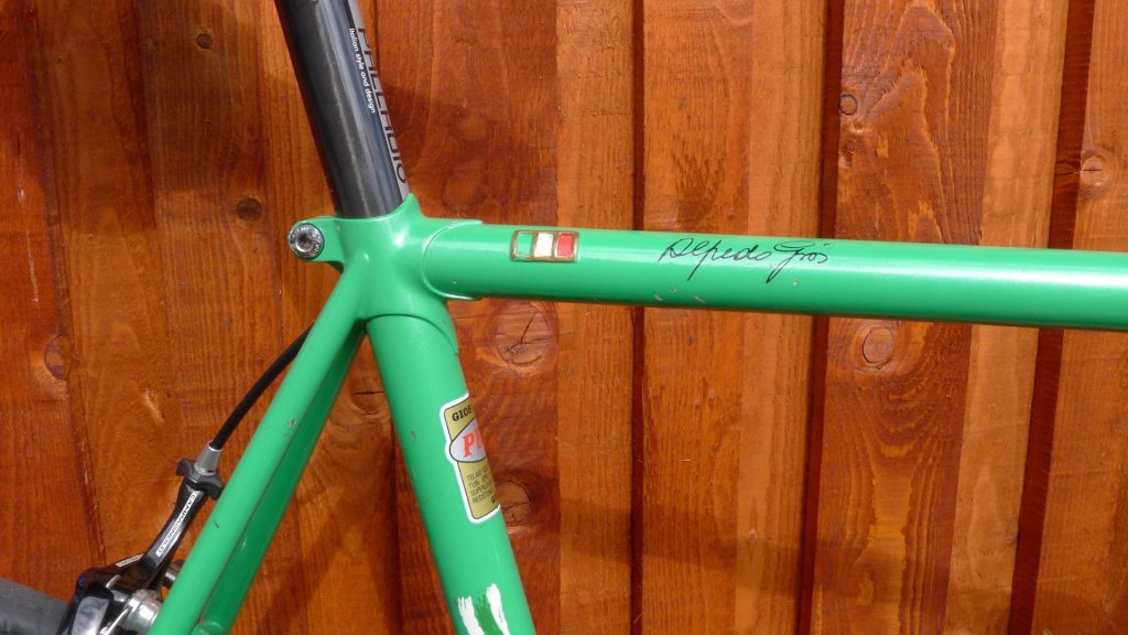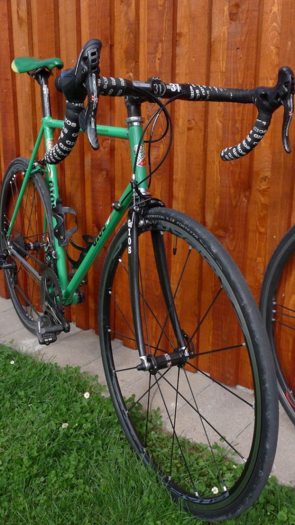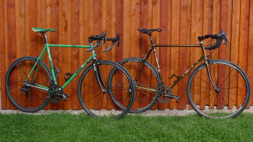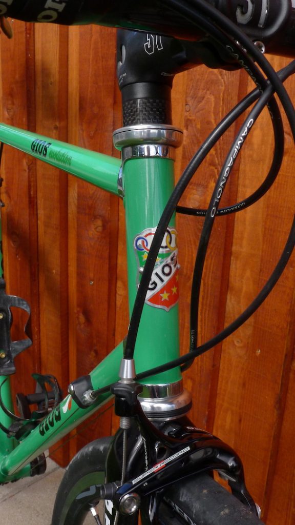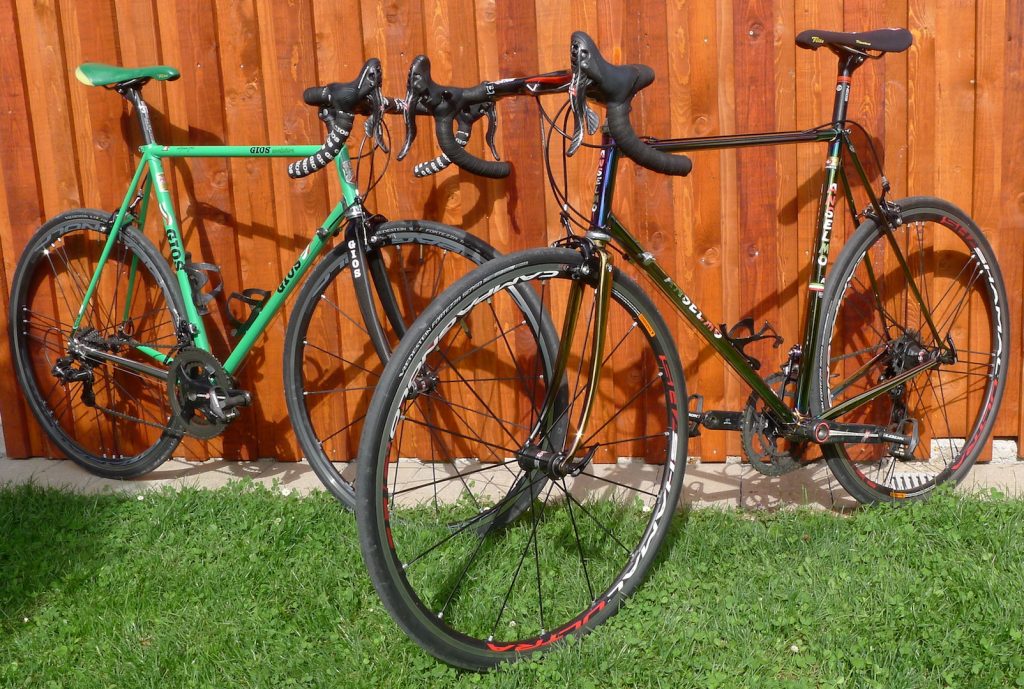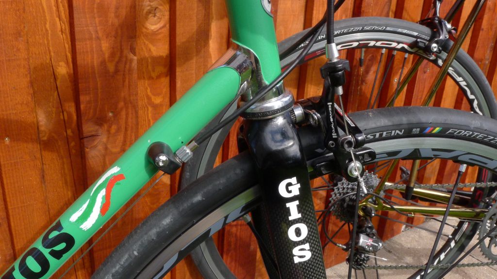 Qua ci sono due mie Neo-Retro bici da corsa. Gios Evolution-Compact e Anselmo con forcella Columbus Air. Gios non e' blu come diceva il Sig. Alfredo Gios, solo che per me e' una delle bici piu' belle. Quando lo comprata da un Sig. di Torino, mi disse che e' il colore originale e che la comprata come primo propietario in un negozio nelle sue vicinanze. Aveva su gia' il gruppo Shimano 600 Tricolor. La forcella era un po' arrugginita dal interno dove passa la ruota e cosi lo mandata a ri-cromare. Mentre aspettavo la forcella ho deciso di mettere su una nuova forcella di Carbonio di un police che gia' avevo. Ho messo il gruppo nuovo Campagnolo Super Record 11v dal fine 2017 con nuovi cerchi Campagnolo Shamal Ultra. Cosi e' diventata la mia prima bici con un gruppo recente. Con essa faccio moltissimi km.