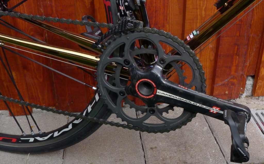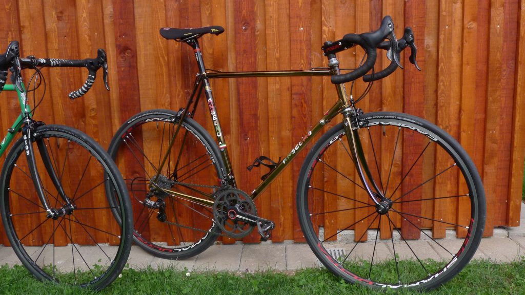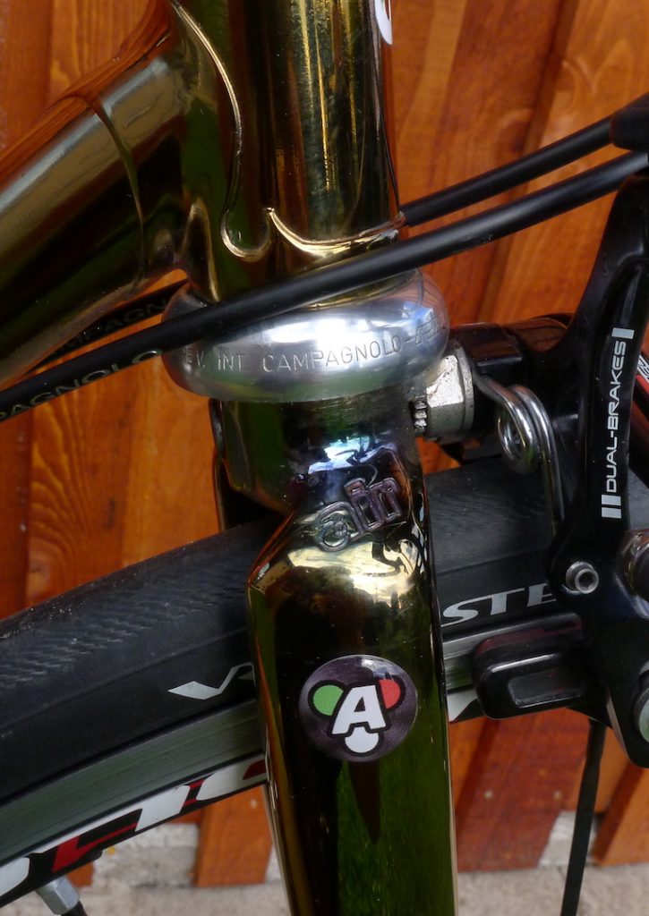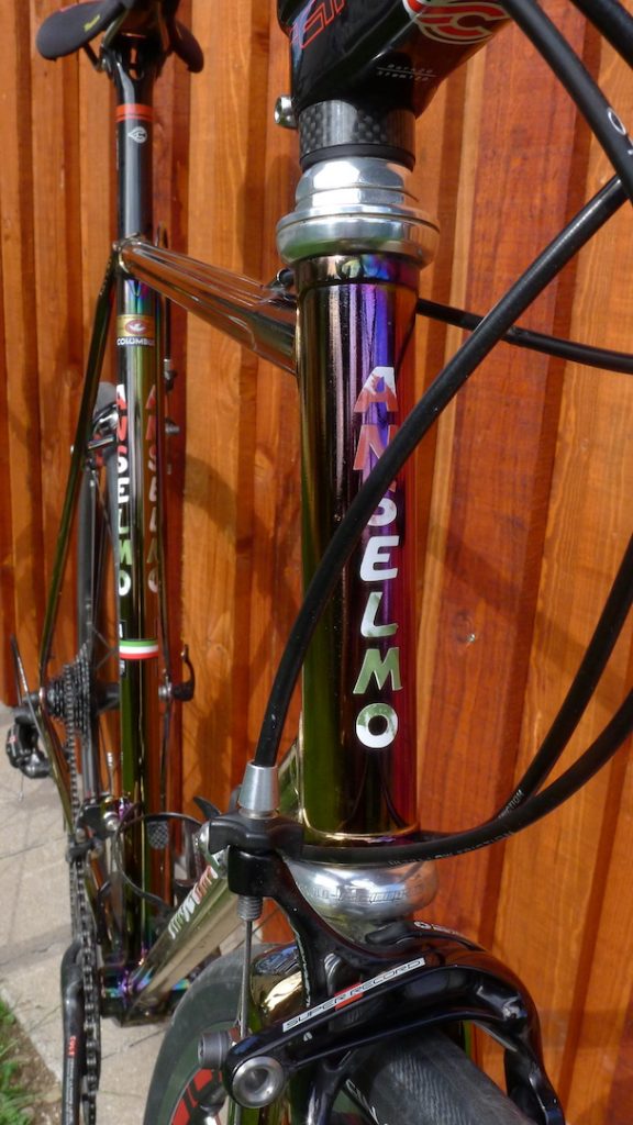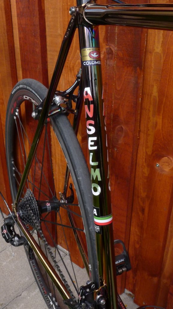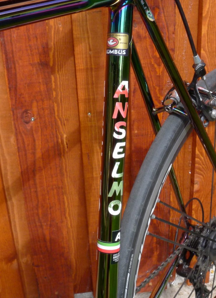 Seconda bici e una Anselmo. Lo comprata da un ragazzo italiano. La messa in vendita con forcella cromata ma il telaio era grezzo. Il telaio lo fato cromare a nuovo. Dopo cromatura ho deciso di provare un progetto nuovo e mettere il telaio e forcella nella stanza di vacuum a farlo d'oro antico. L'amico mi ha chiamato che il progetto non aveva successo ma quando lo visto da persona ho detto ad mio amico, piu' che successo. Ho messo Il gruppo Campagnolo Super Record 11v dal 2014 con sempre cerchi Campagnolo Shamal Ultra. Cosi e' diventata un'altra bici per percorsi lunghi.