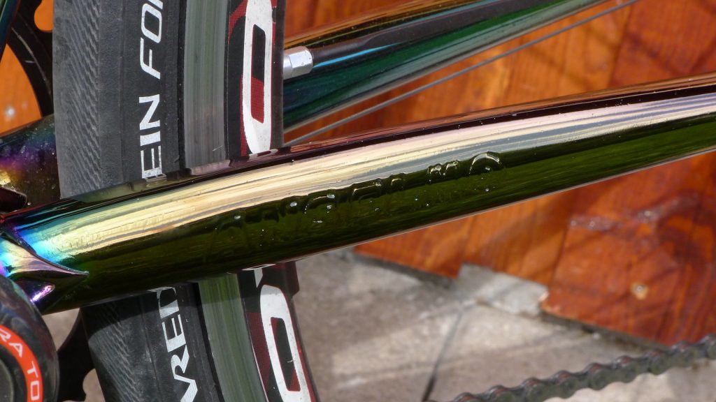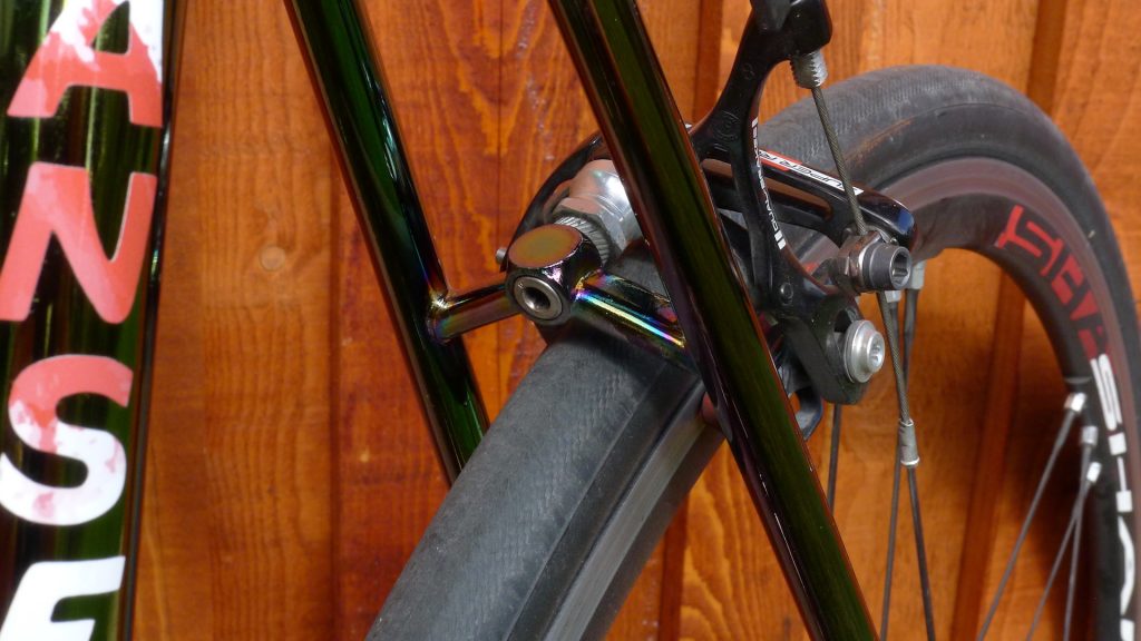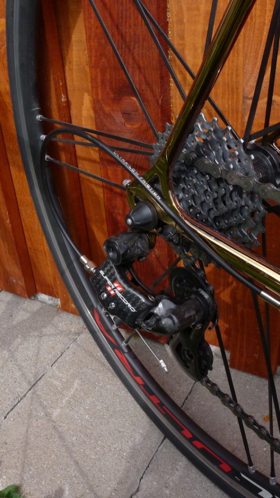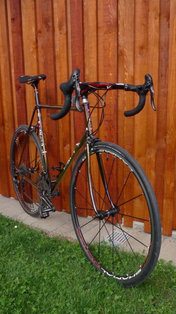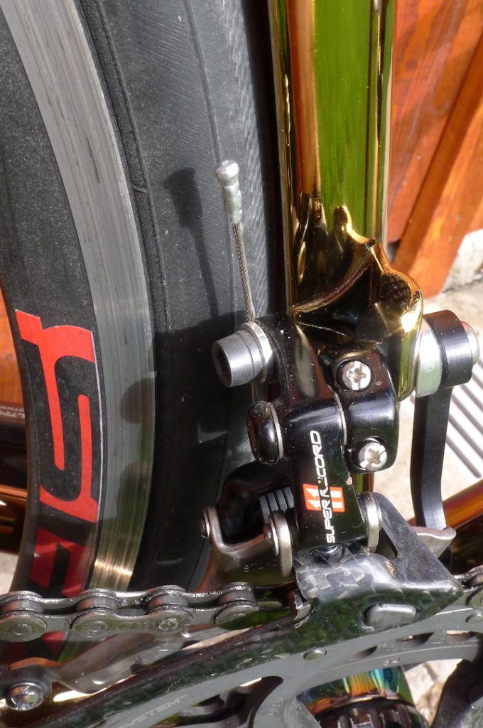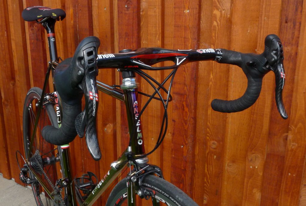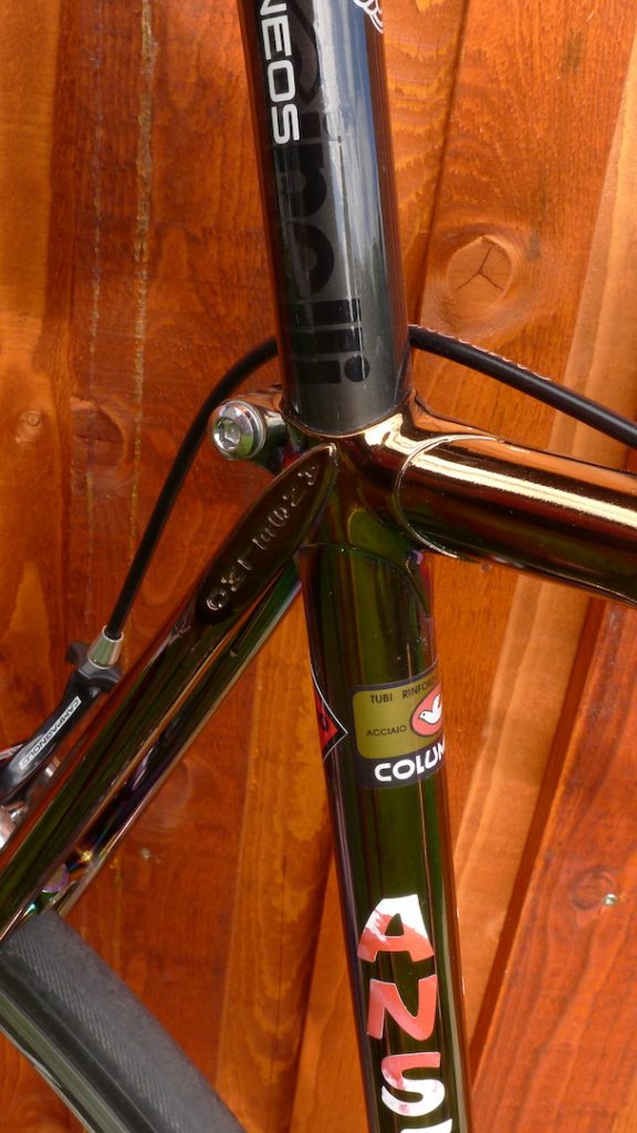 Seconda bici e una Anselmo. Lo comprata da un ragazzo italiano. La messa in vendita con forcella cromata ma il telaio era grezzo. Il telaio lo fato cromare a nuovo. Dopo cromatura ho deciso di provare un progetto nuovo e mettere il telaio e forcella nella stanza di vacuum a farlo d'oro antico. L'amico mi ha chiamato che il progetto non aveva successo ma quando lo visto da persona ho detto ad mio amico, piu' che successo. Ho messo Il gruppo Campagnolo Super Record 11v dal 2014 con sempre cerchi Campagnolo Shamal Ultra. Cosi e' diventata un'altra bici per percorsi lunghi.