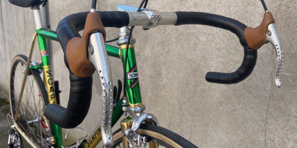 Read moreScapin Airone made for Sanvido workshop. The frame is entirely gold-plated with real Gold. Then sprayed in cromovelato green paint. The Columbus tubes are oval and has air shifting levers Modolo. All group is Campagnolo Super Record, just headset is…
