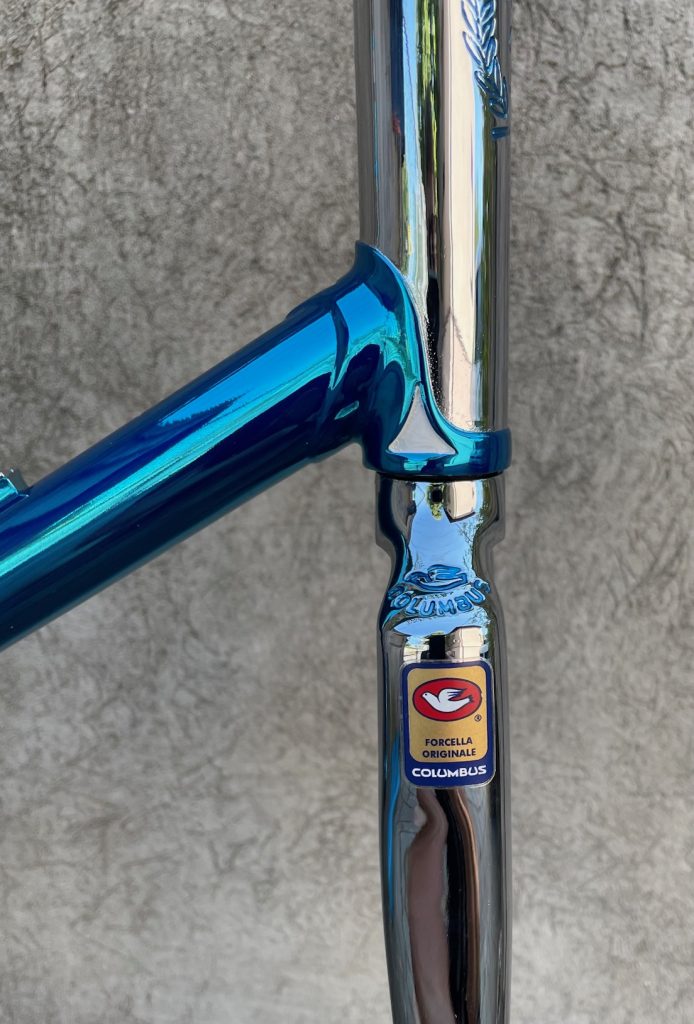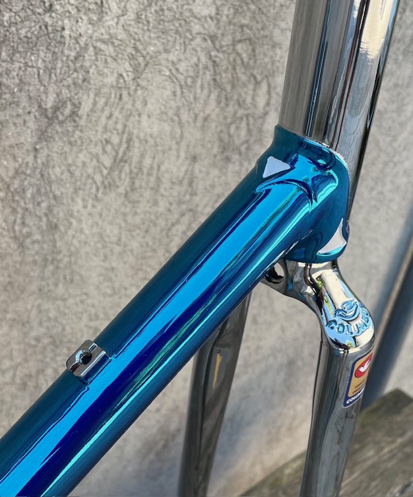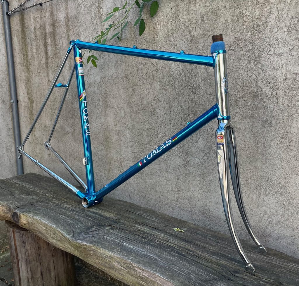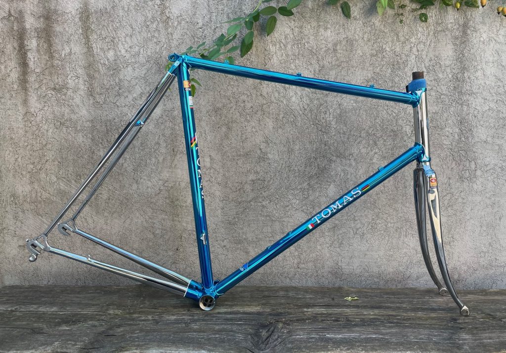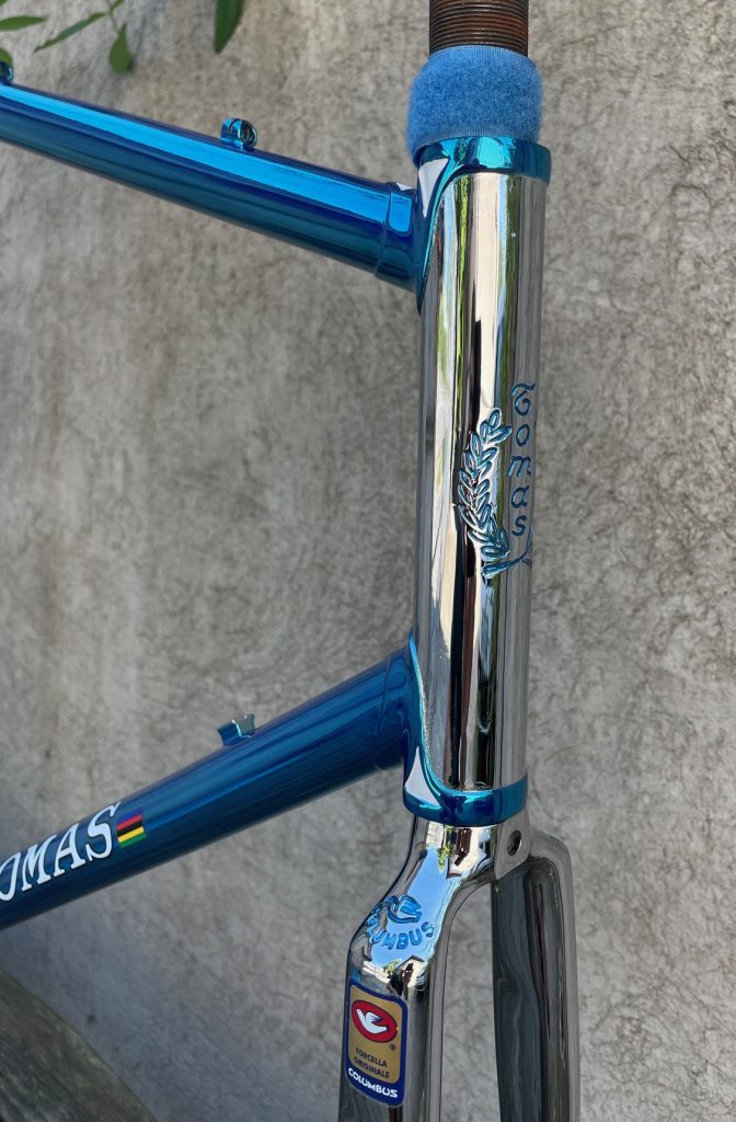 Here is a restoration of Tomas frame made in the beginning 80s by Giuseppe Orsato from Piazzola di Brenta (PD) - Italy. Still propriety of first owner. He wanted to change broken chain stays with the same engraved left one with same gravure Air Columbus. The second reparation was on cable guide hangers on top tube. We replace all three. Then rechromation of all frame and fork and finishedwith Cromovelato paint job. Nice frame....