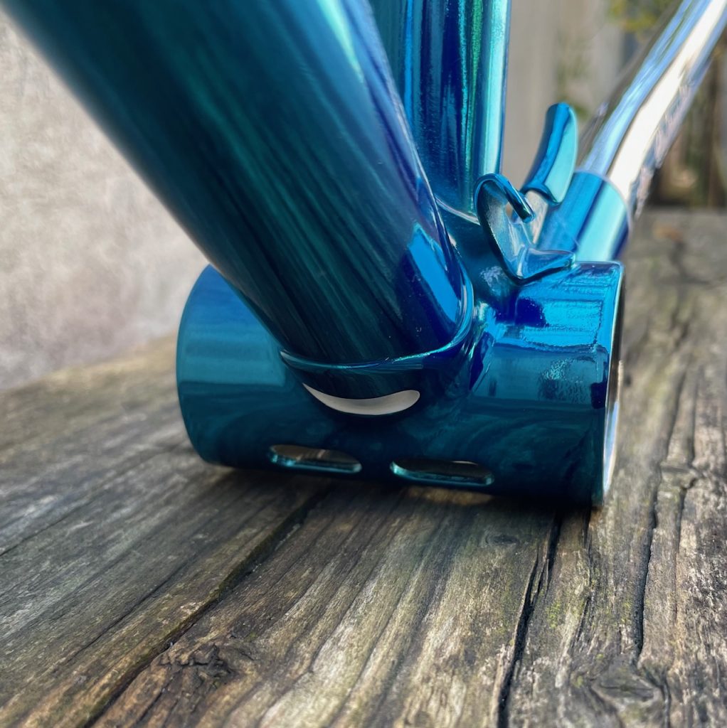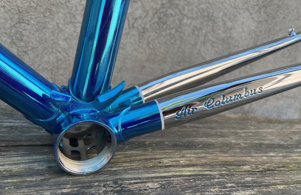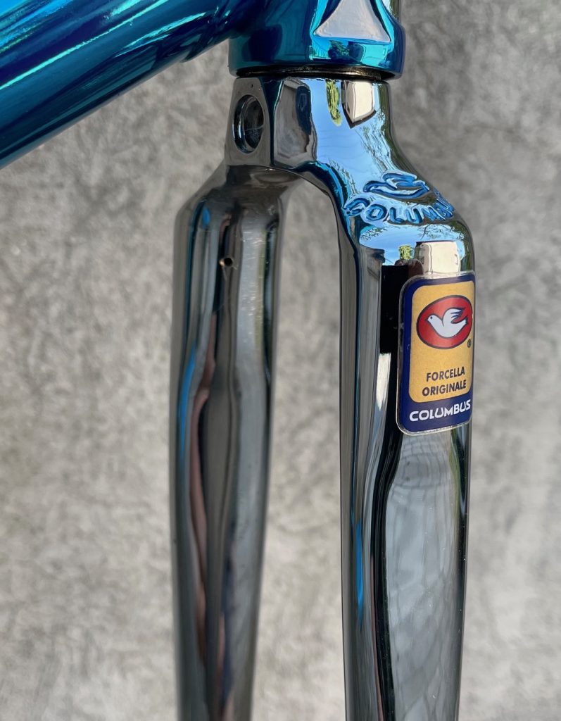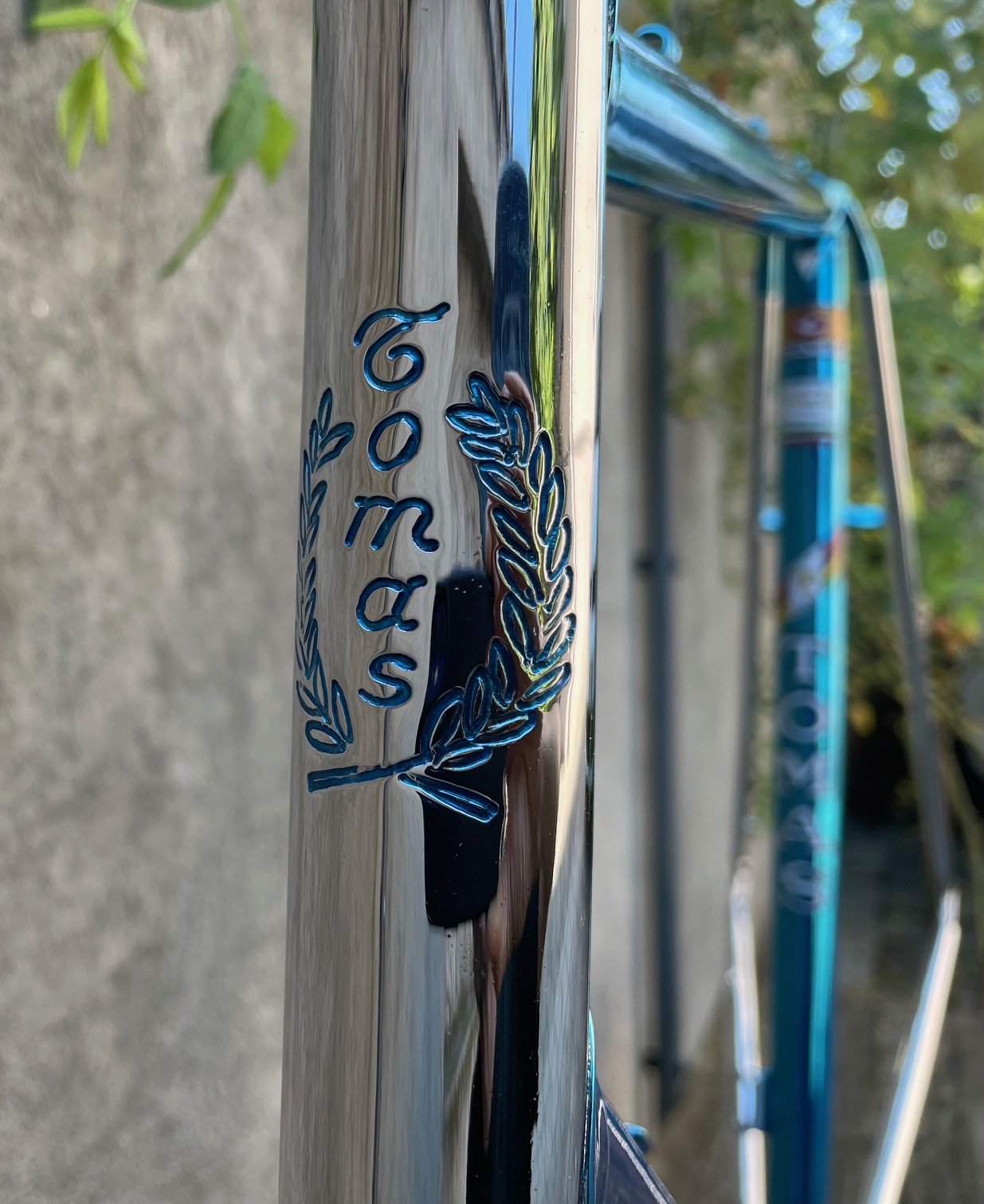 Here is a restoration of Tomas frame made in the beginning 80s by Giuseppe Orsato from Piazzola di Brenta (PD) - Italy. Still propriety of first owner. He wanted to change broken chain stays with the same engraved left one with same gravure Air Columbus. The second reparation was on cable guide hangers on top tube. We replace all three. Then rechromation of all frame and fork and finishedwith Cromovelato paint job. Nice frame....